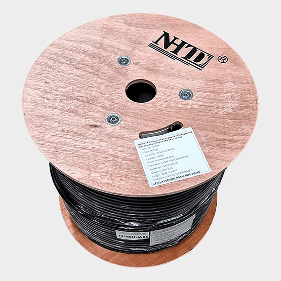 Cable de red FTP categoría 6A marca NHTD para exterior con mensajero. Con 4 pares trenzados compuestos de conductores de cobre sólido, 23 AWG, con blindaje de aluminio.